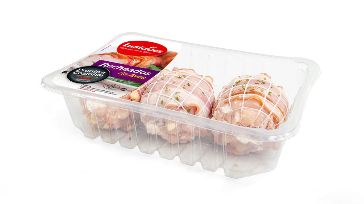 Boneless chicken thigh, wrapped in a slice of bacon and seasoned with thyme, placed inside a grill.